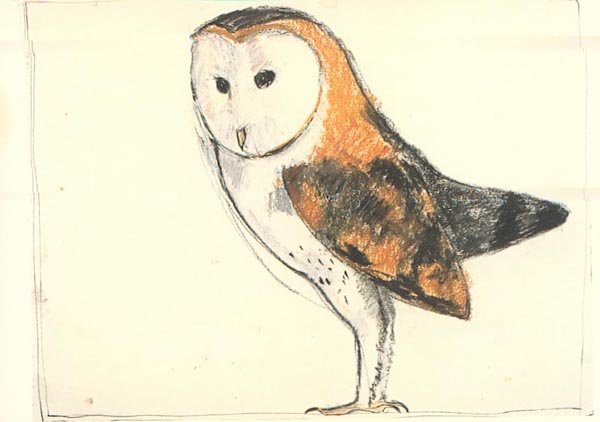 Staande kerkuil, krijt op papier, 60 x 75 cm (X)